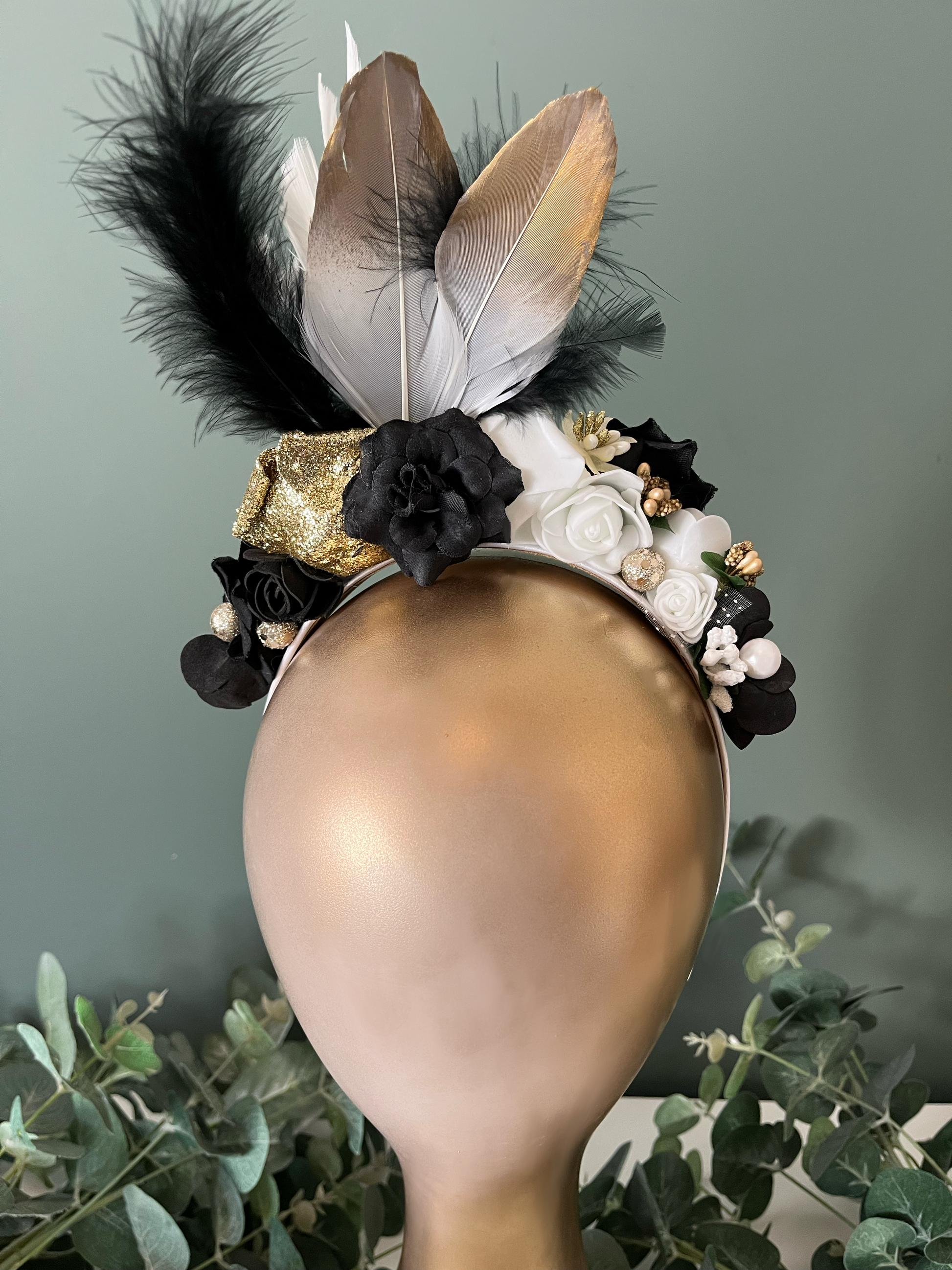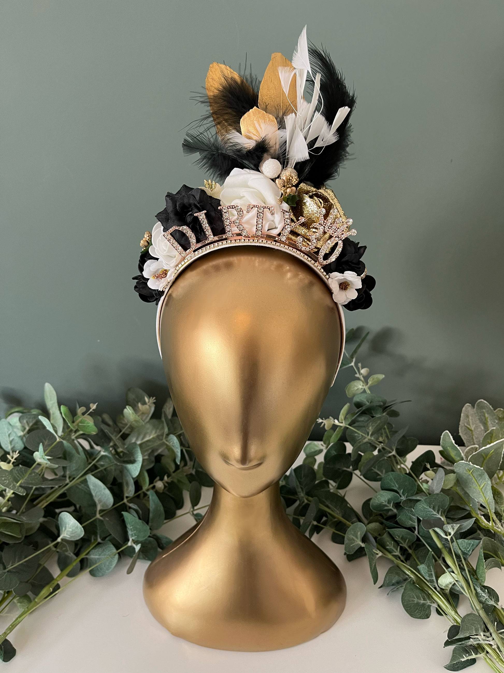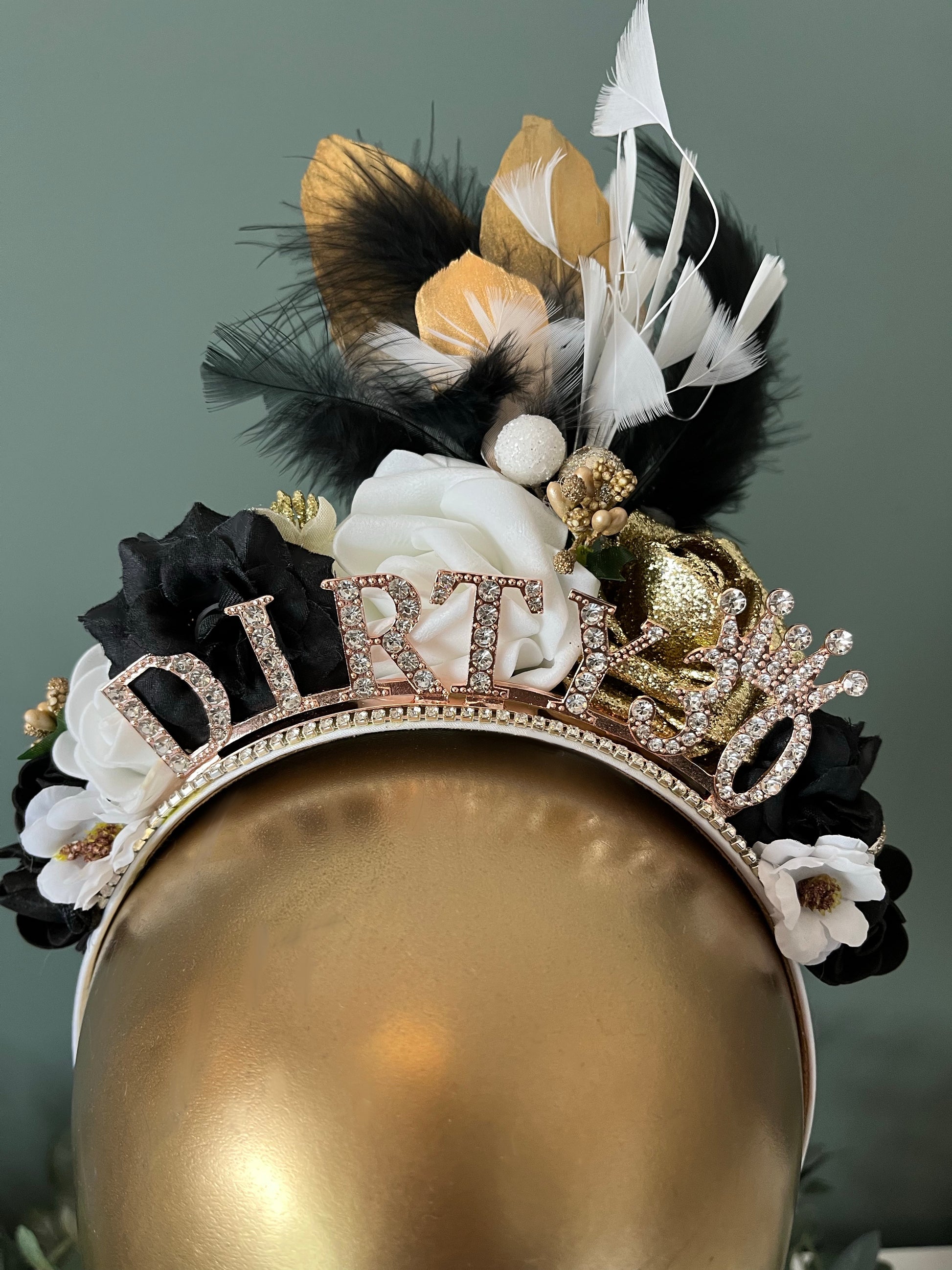 Celebrate your milestone in style with our bold and glamorous "Dirty 30" Headband! This headband features a rhinestone "DIRTY 30" centerpiece, surrounded by black and white flowers, gold accents, and a dramatic plume of black, gold, and white feathers.