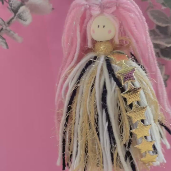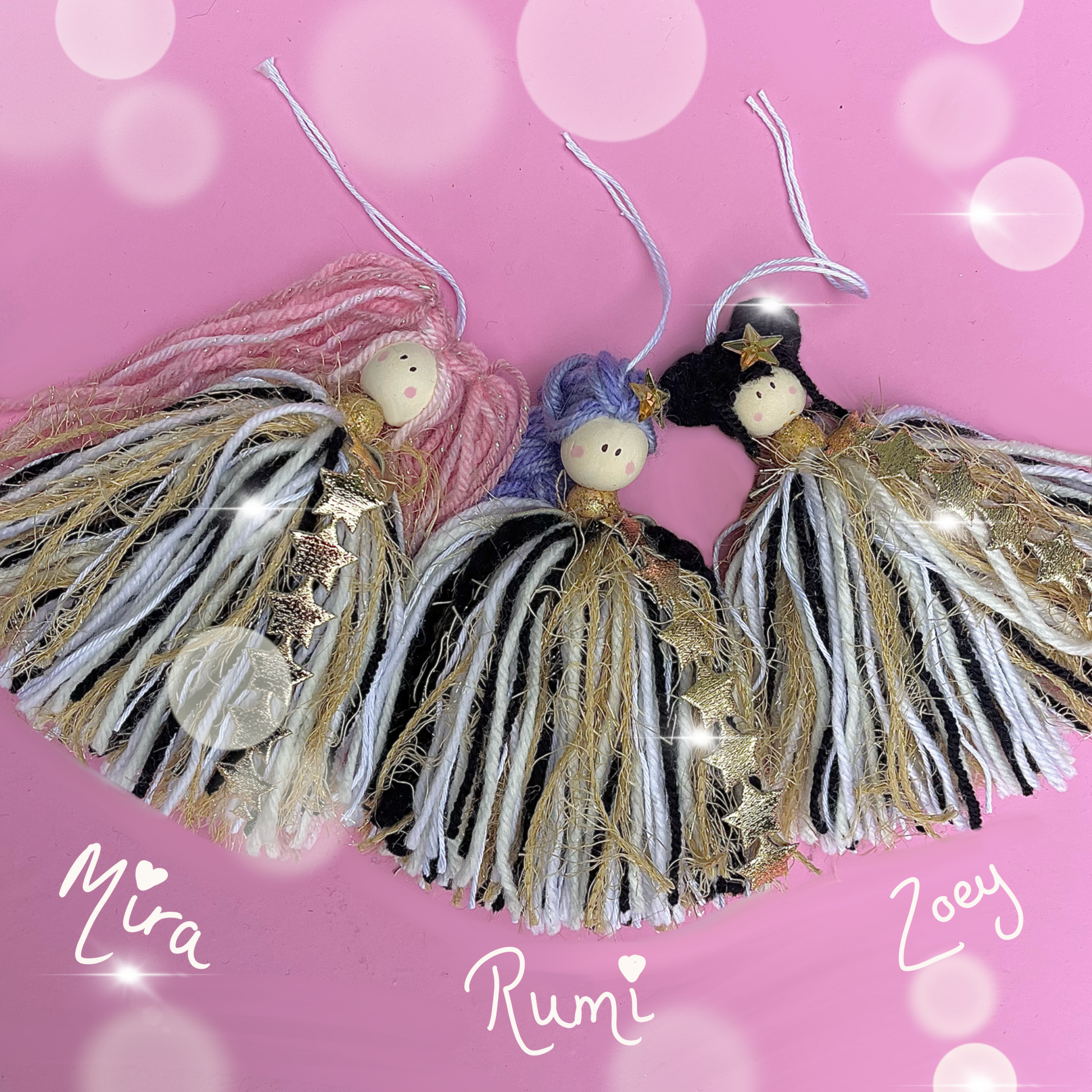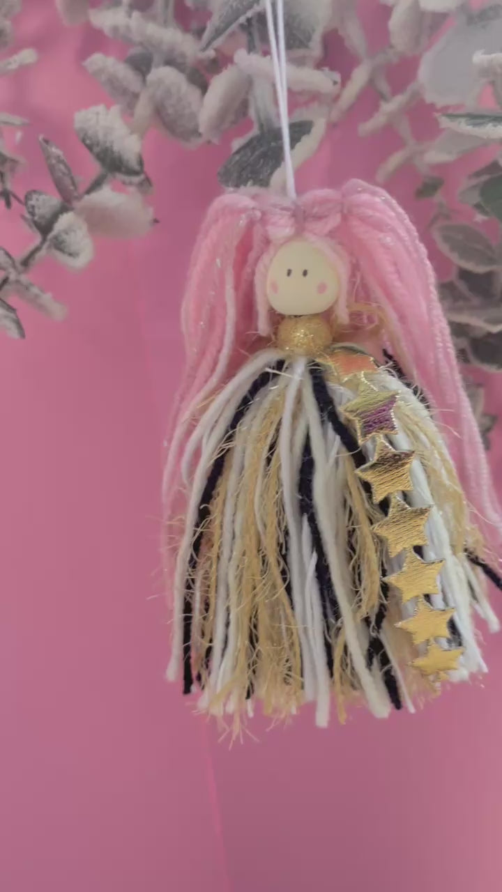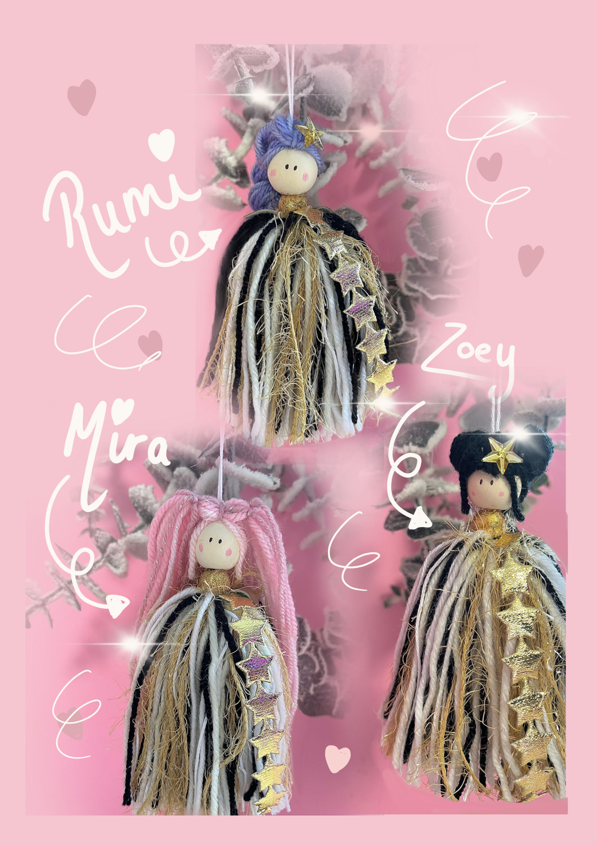 Each piece features gold details, layered yarn outfits, and pastel hair. Hang them on your Christmas tree, use them as bag accessories, or let them shine as year-round room decor.