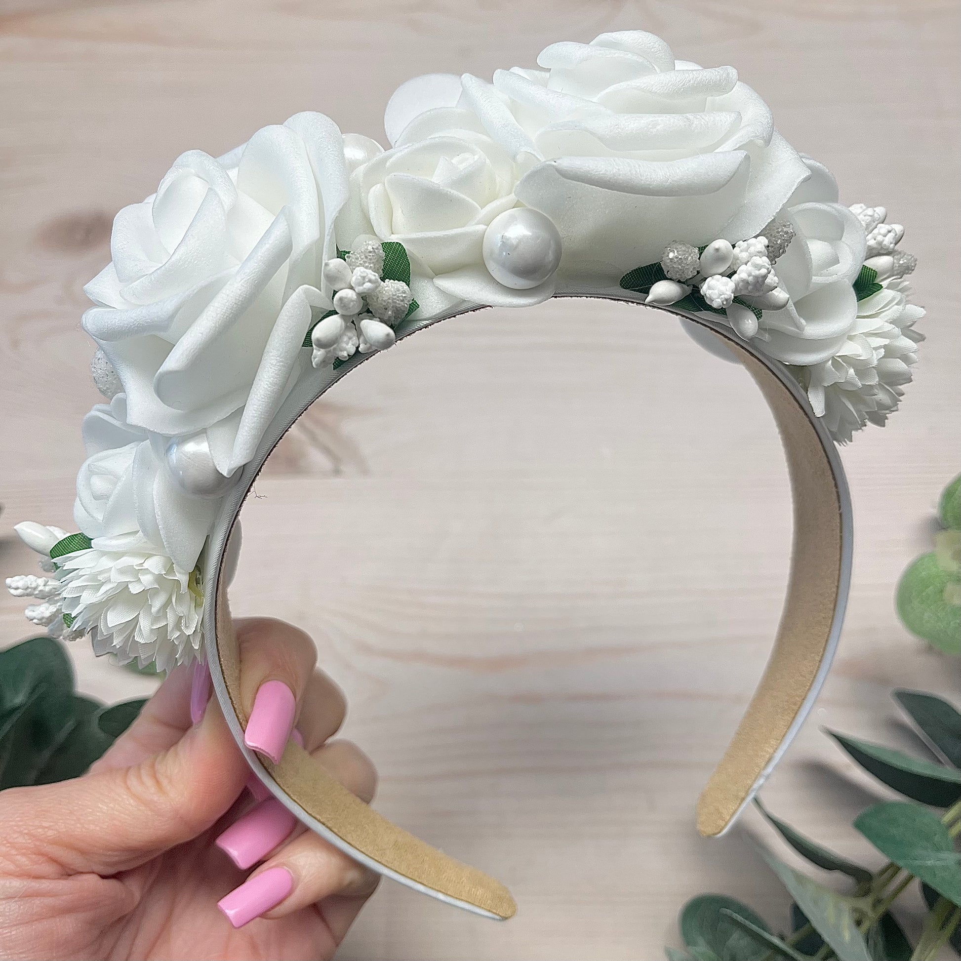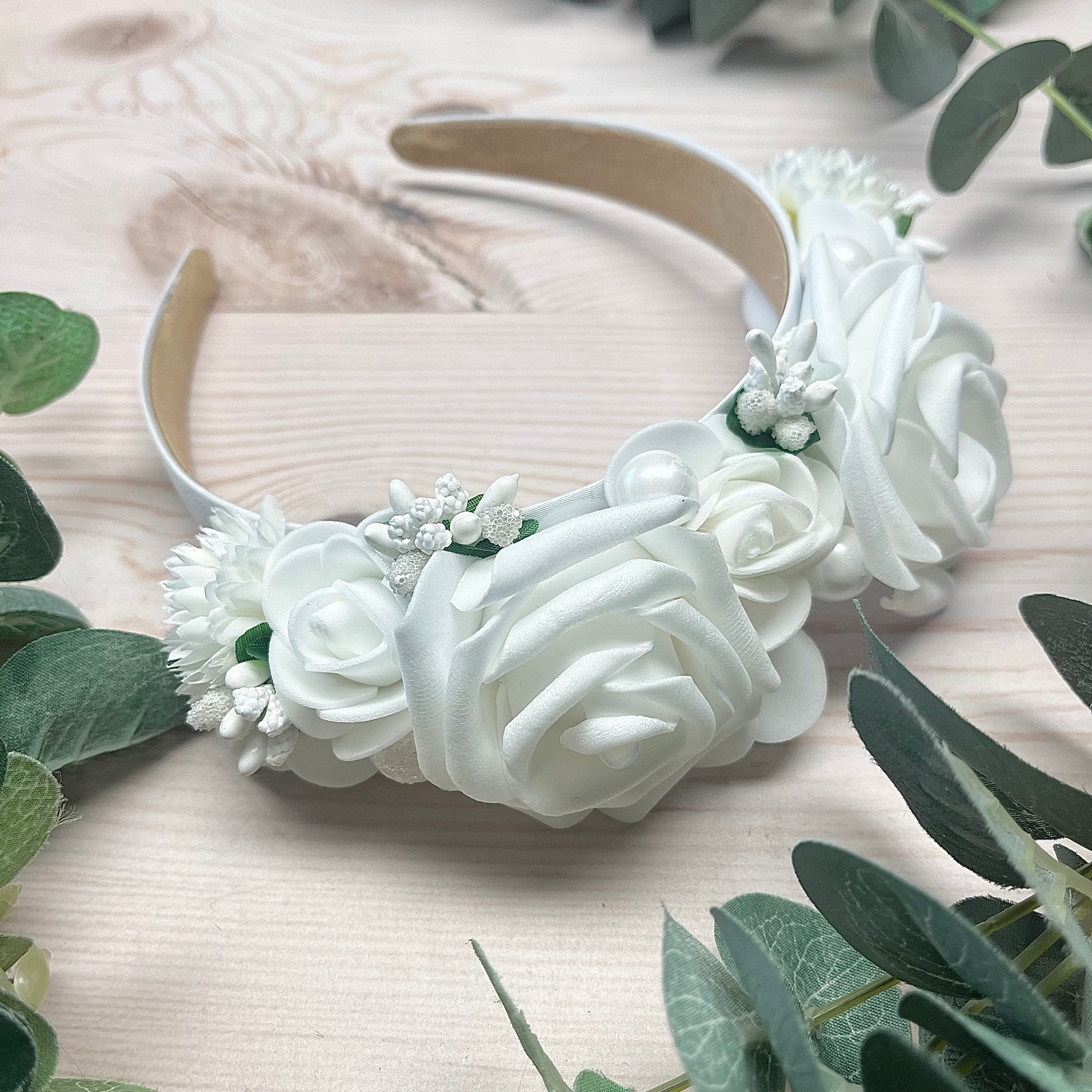 This elegant white floral headband is the perfect accessory for any flower girl. Crafted with white flowers and white decorative items, it adds a touch of charm and sophistication to her look. The lightweight, band ensures a comfortable fit, while the soft flowers create a timeless, graceful appeal that complements both modern and traditional bridal styles. Whether it's for a wedding, special event, or photo shoot, this headband brings a delicate, ethereal touch to her ensemble, making her feel like a little princess.