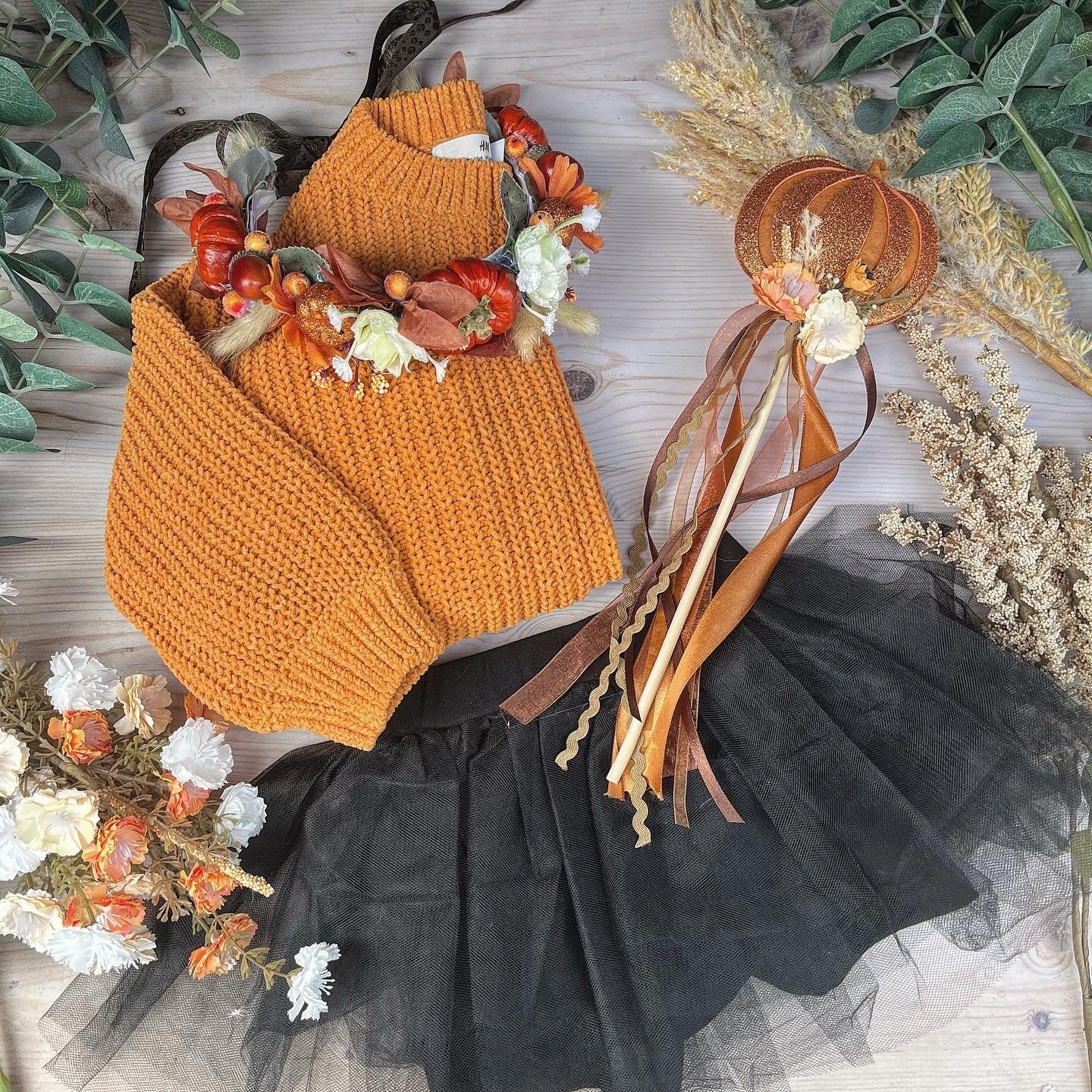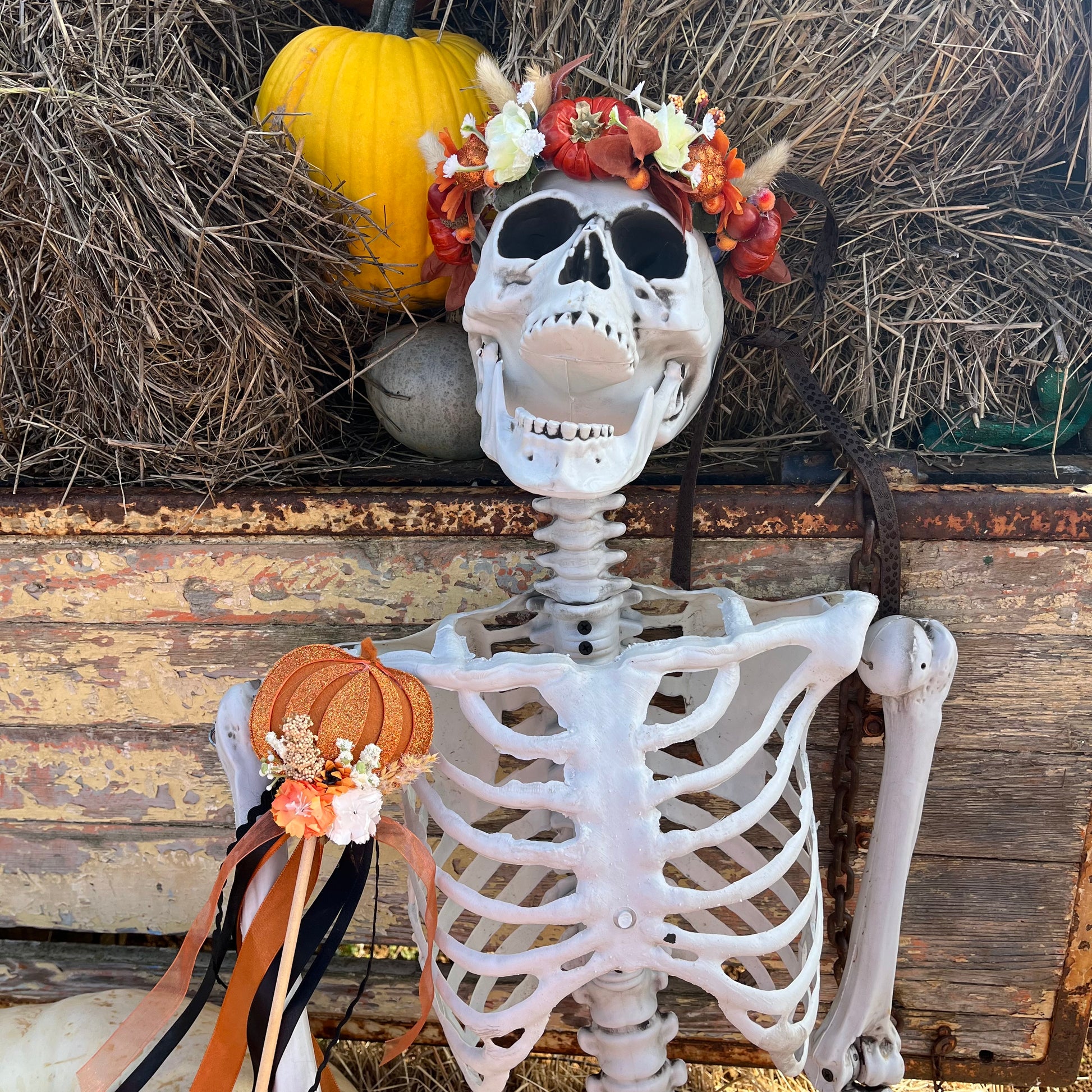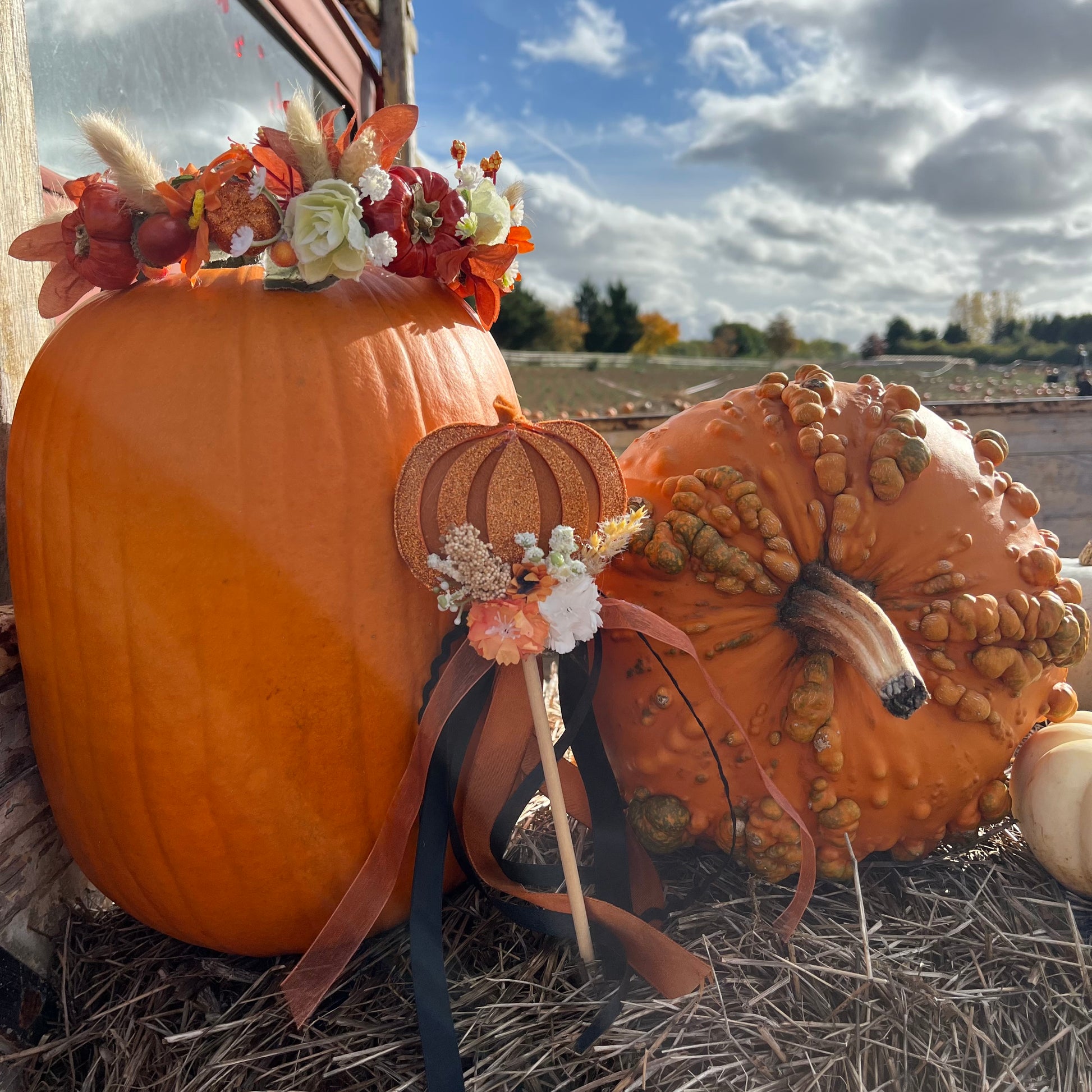 Halloween pumpkin wands finished with a variety of flowers.