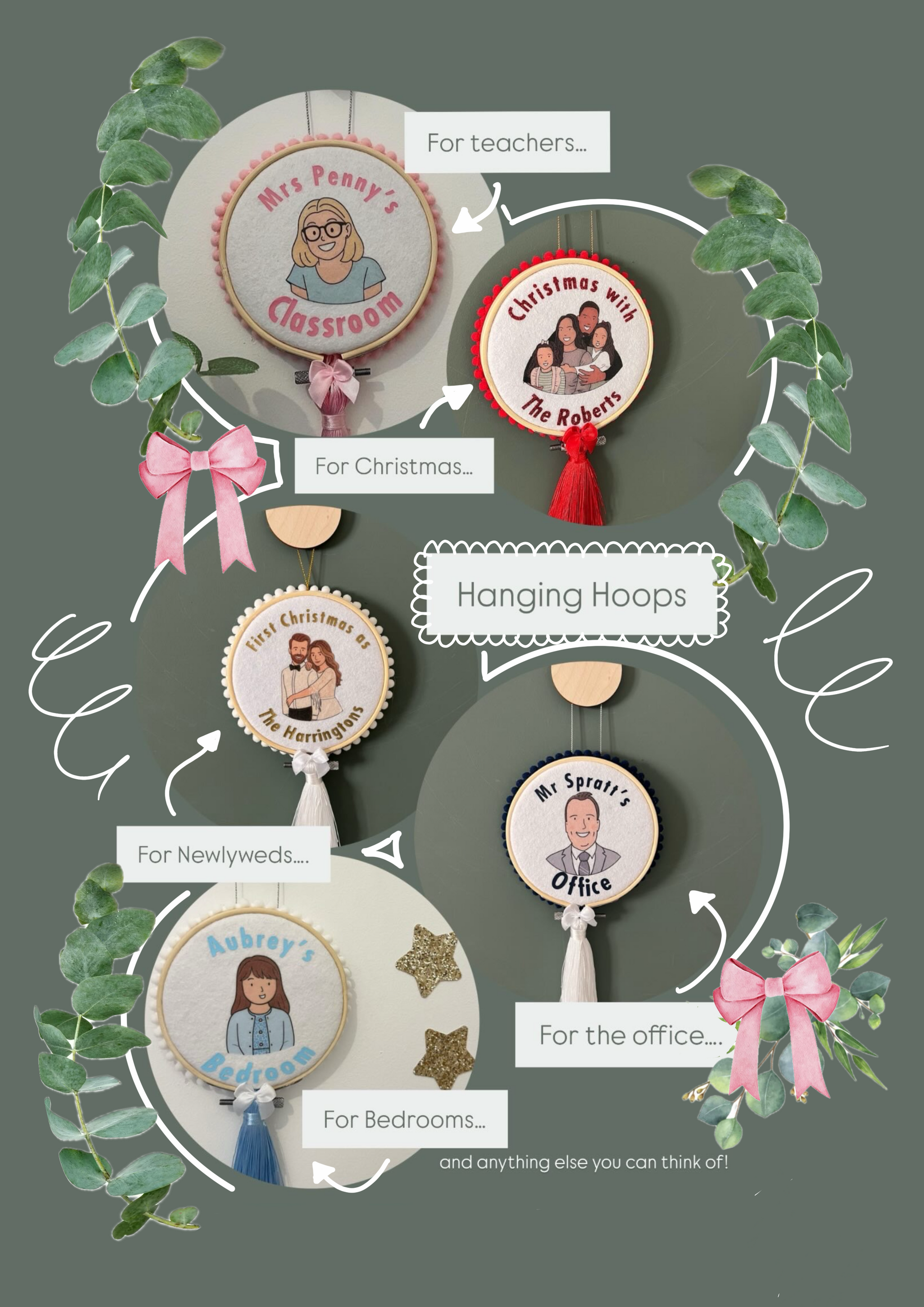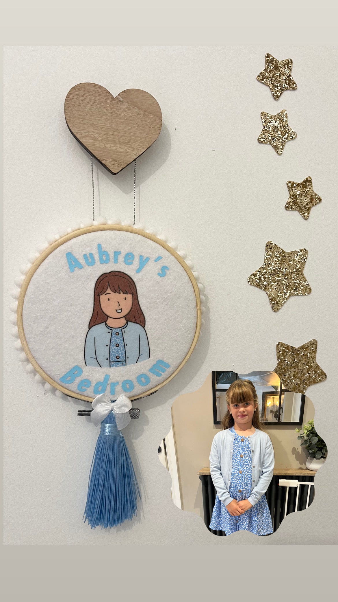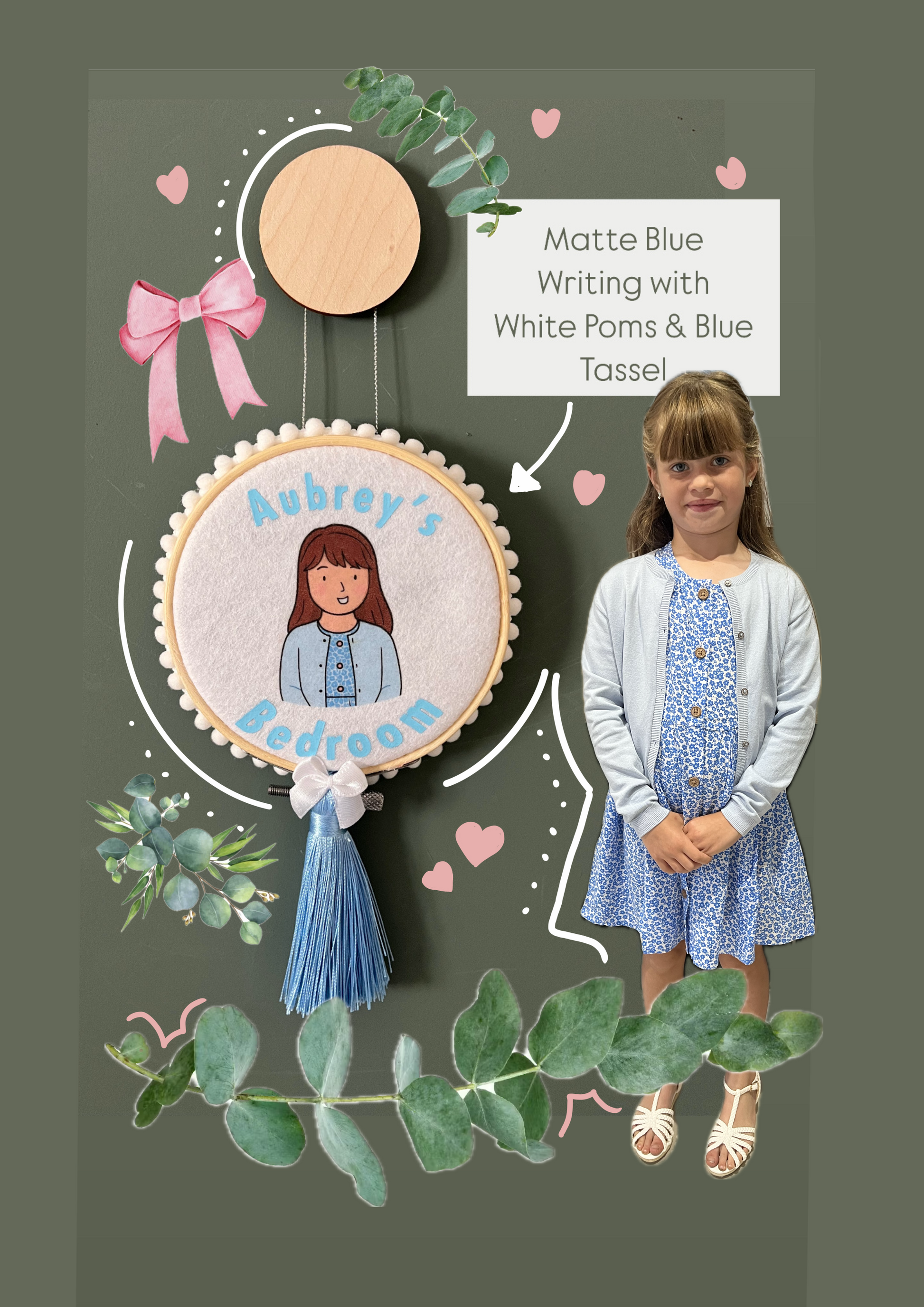 Brighten up any space with these personalised door hangings! Each sign is handcrafted with a soft felt base, framed in an embroidery hoop, and decorated with matching pom-pom trim and a tassel. Featuring a fun illustrated portrait and custom text.
