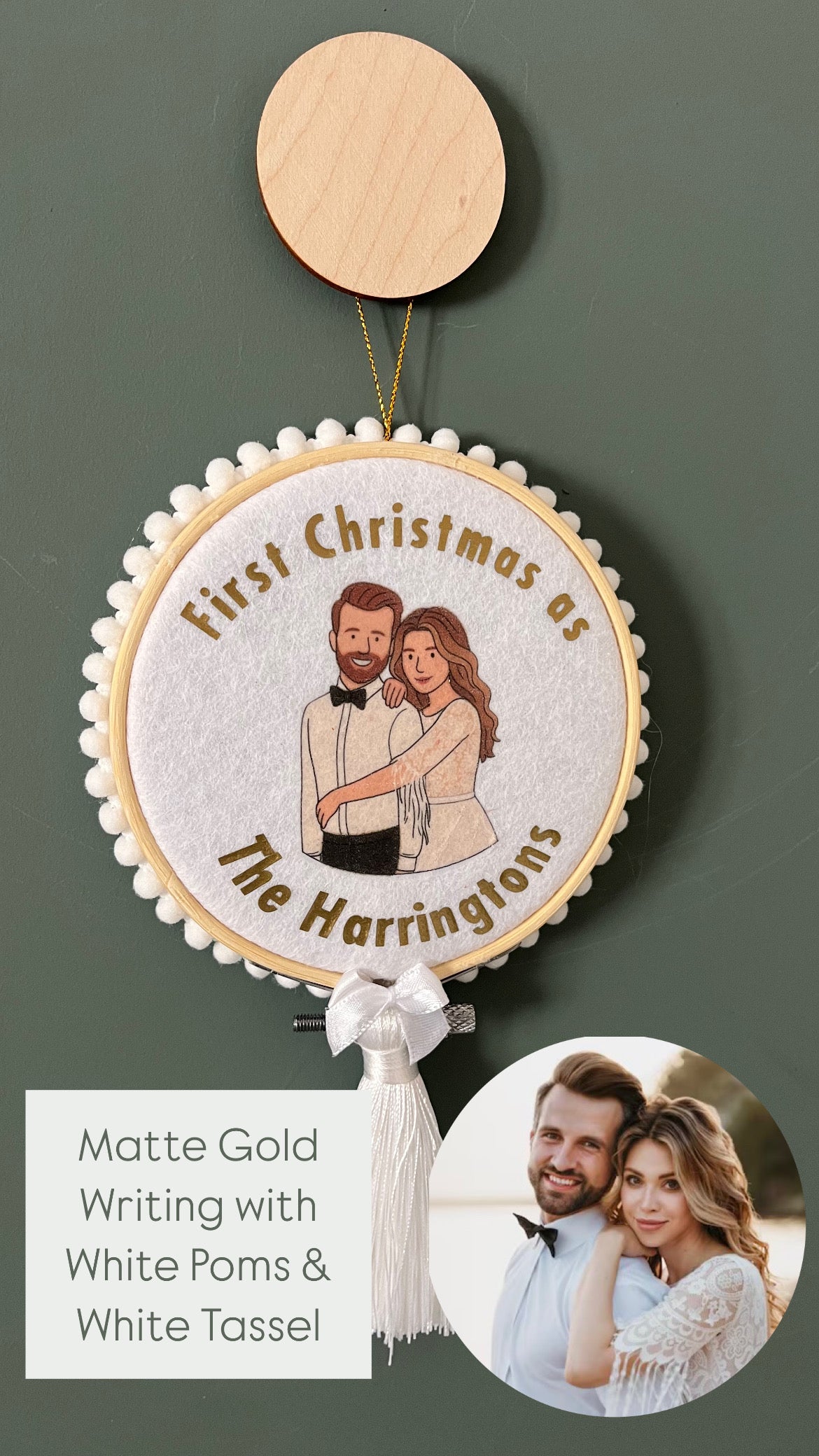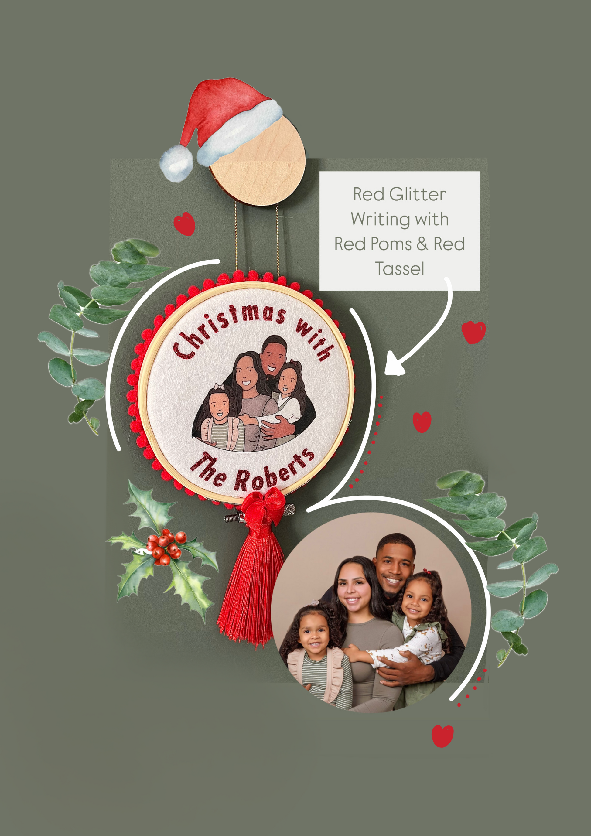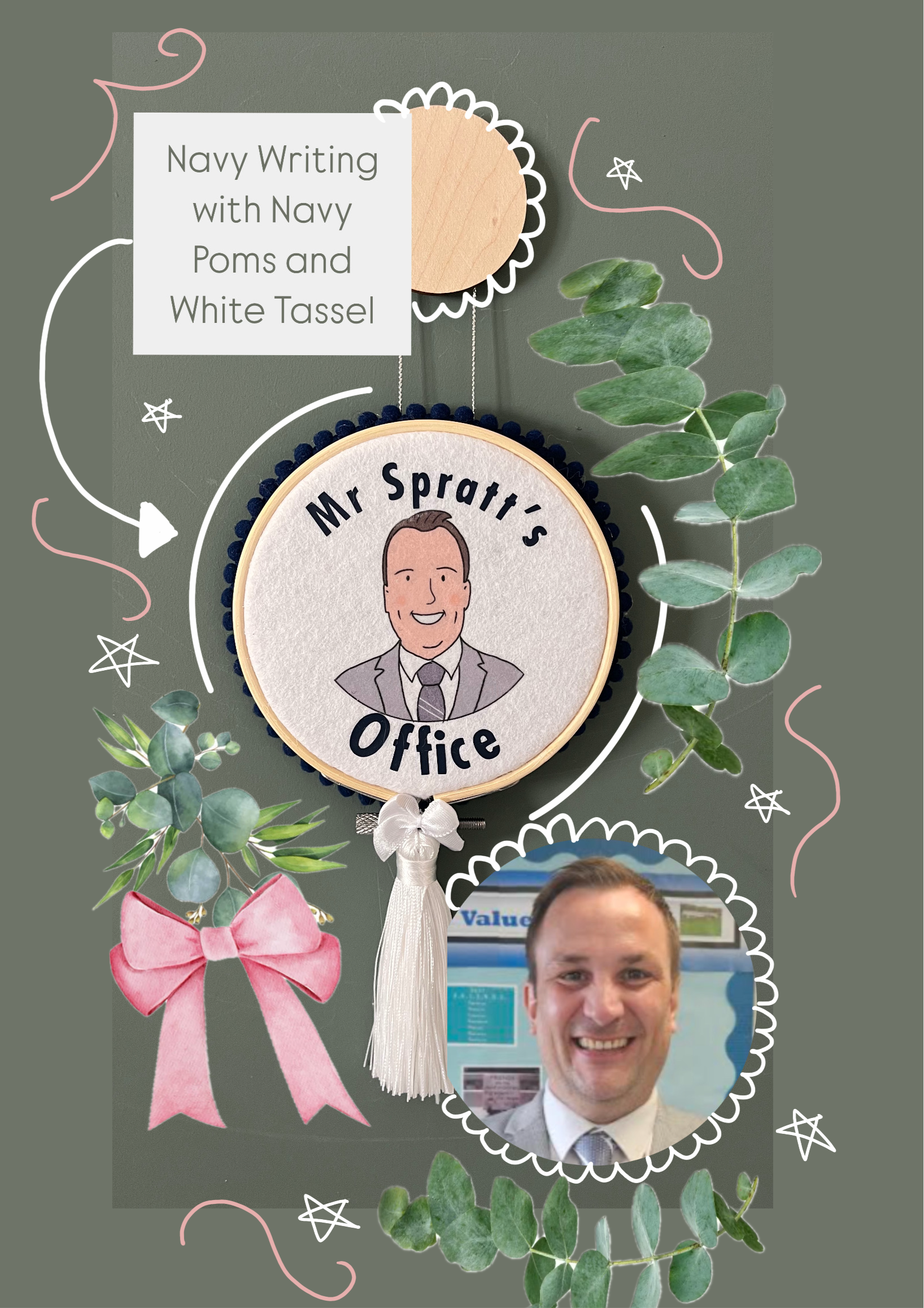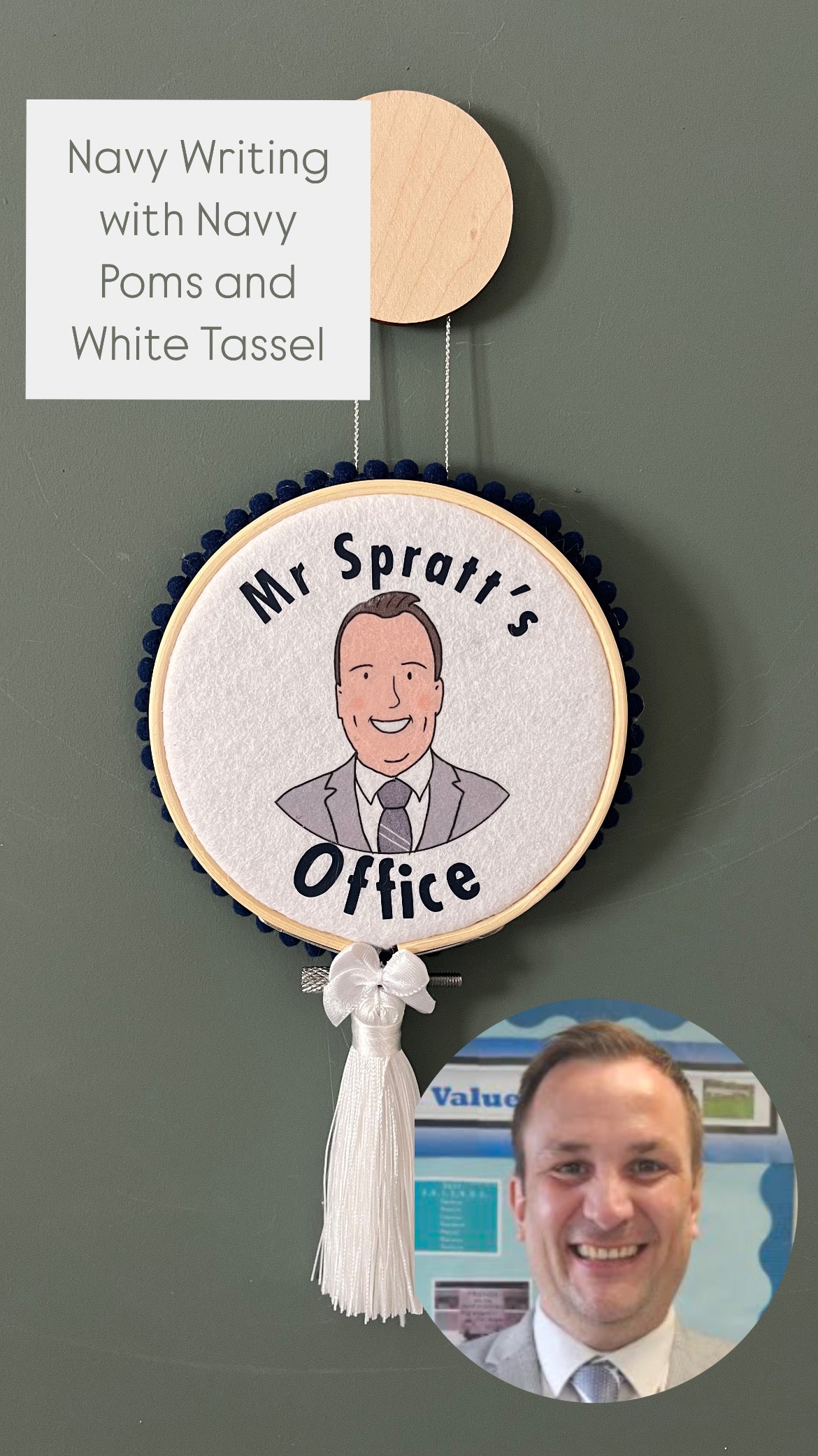 Brighten up any space with these personalised door hangings! Each sign is handcrafted with a soft felt base, framed in an embroidery hoop, and decorated with matching pom-pom trim and a tassel. Featuring a fun illustrated portrait and custom text.
