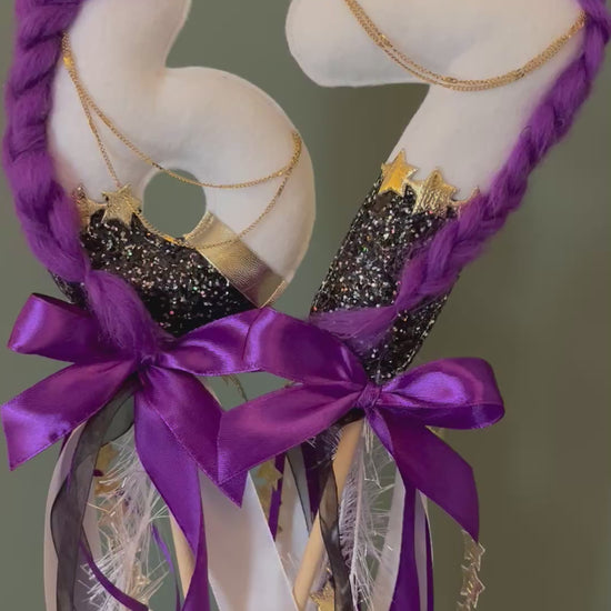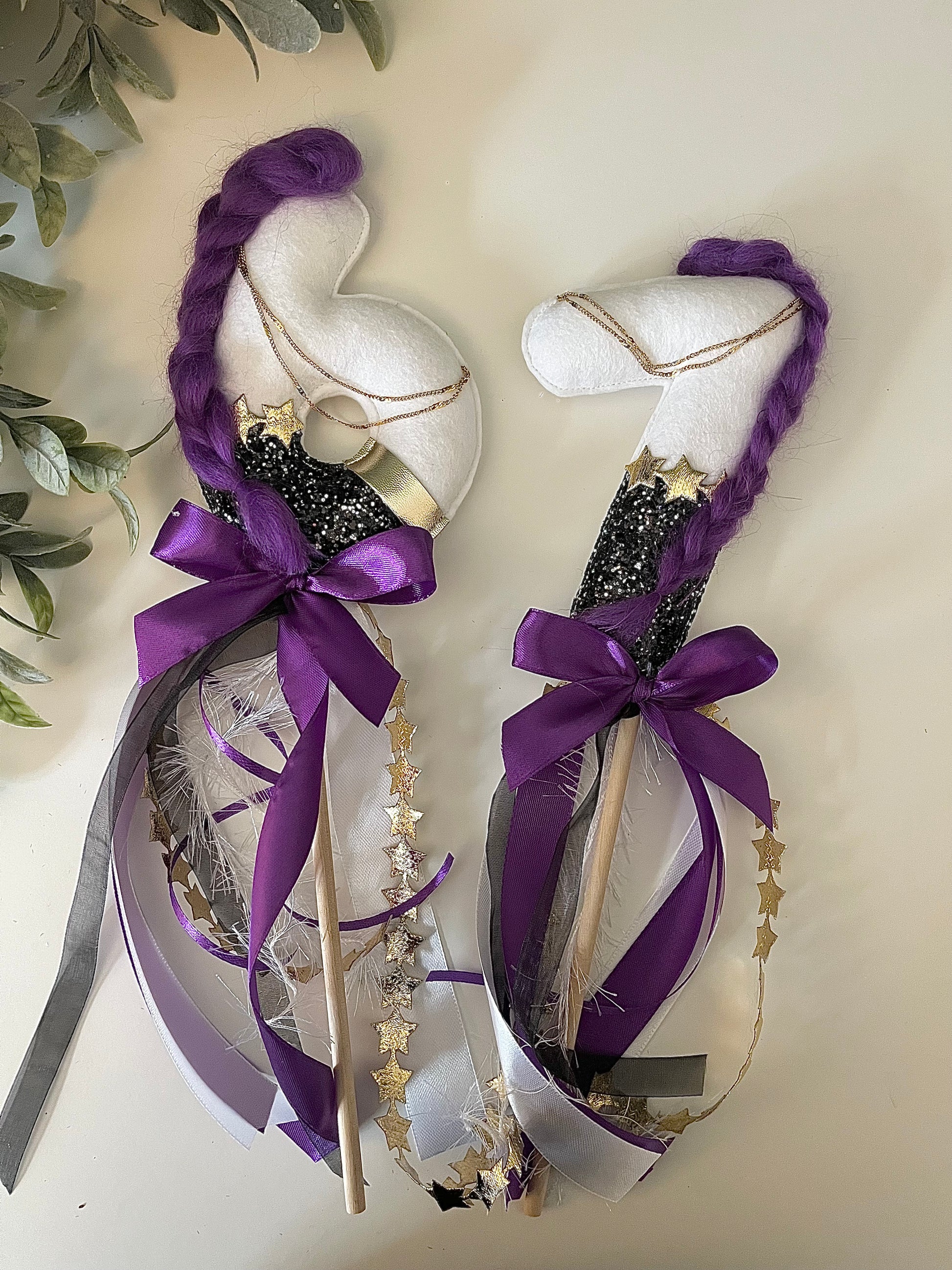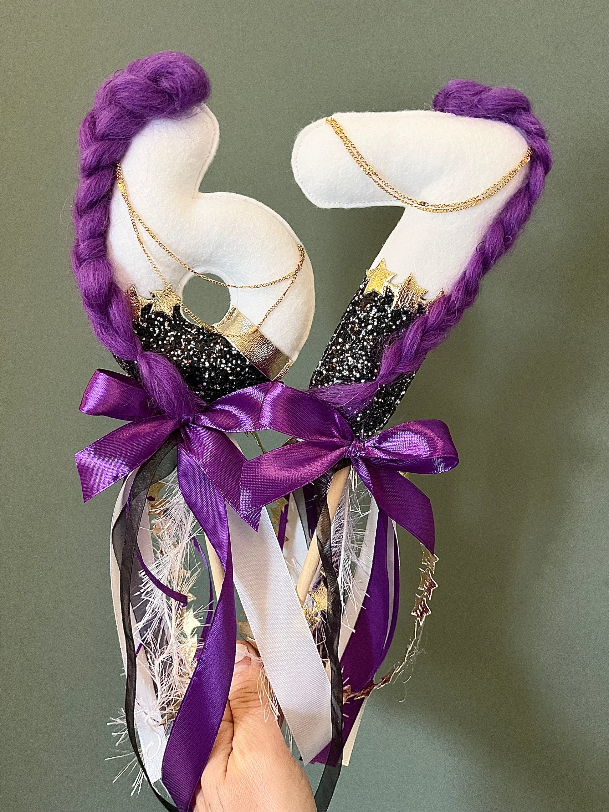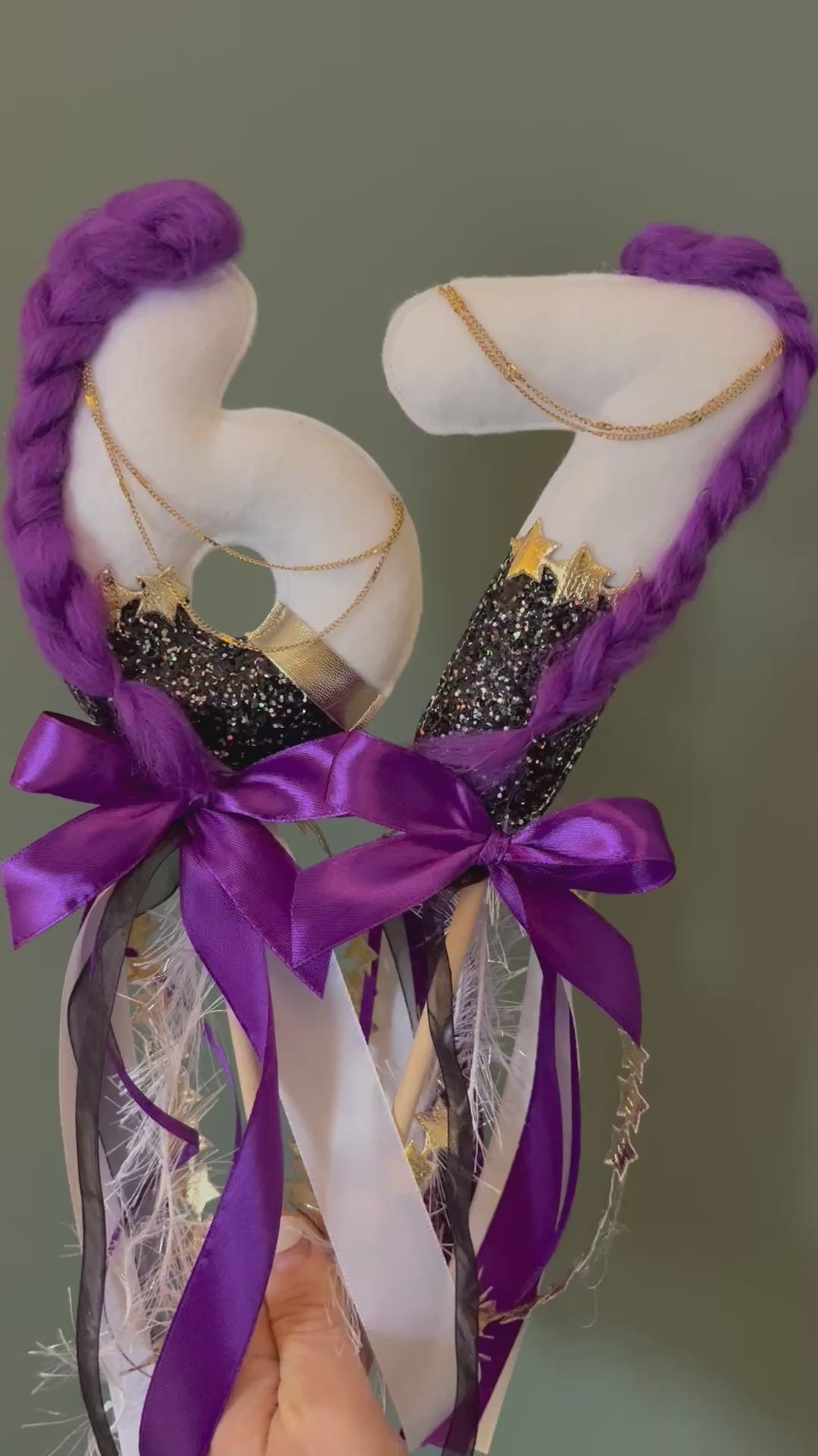 💜 Plush sculpted numbers finished with gold chains and star accents