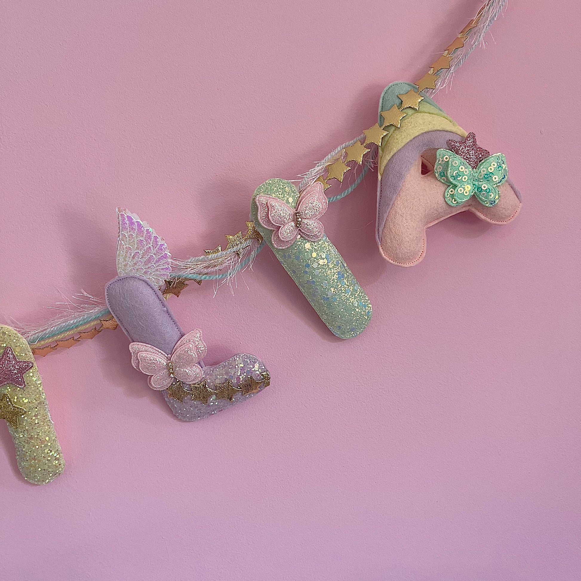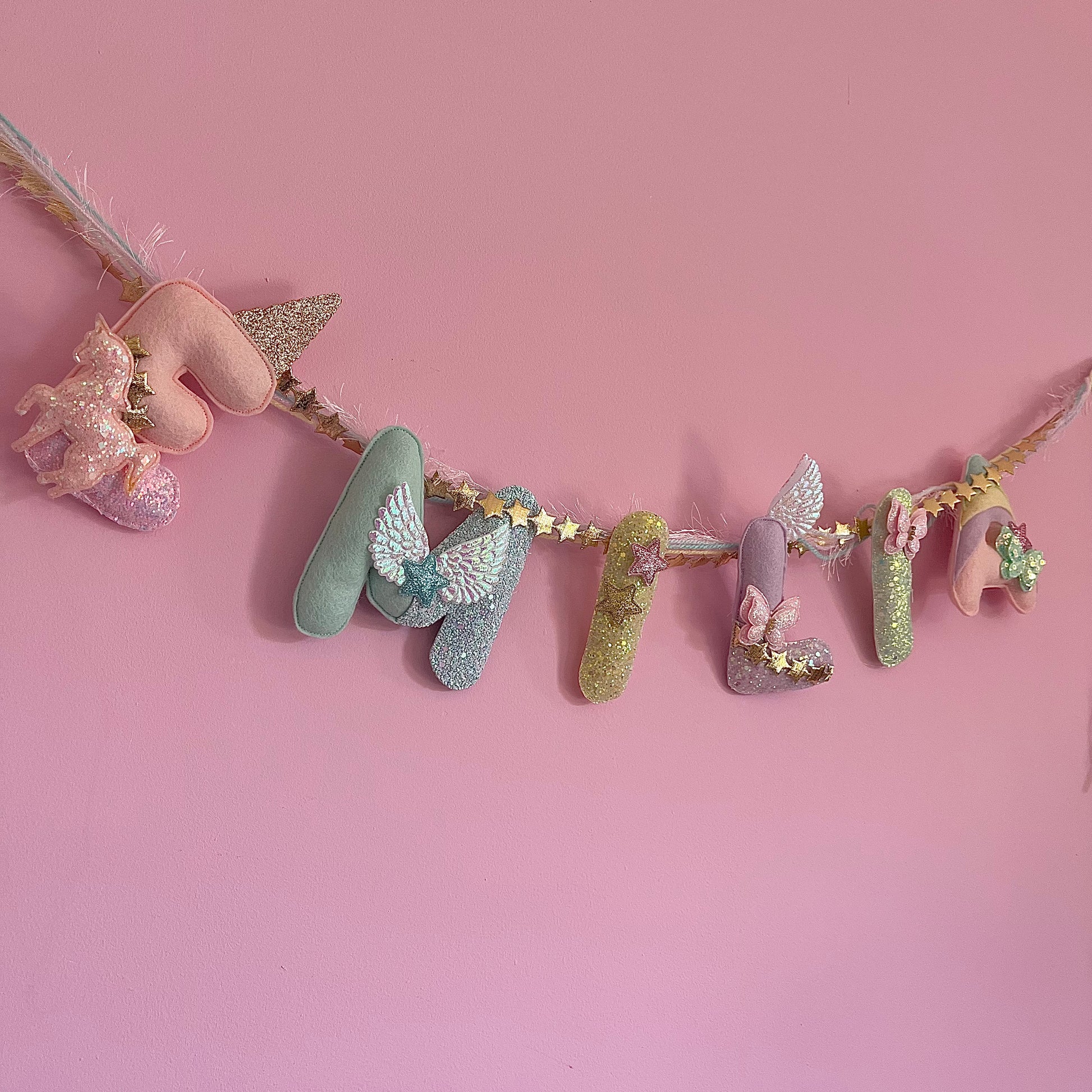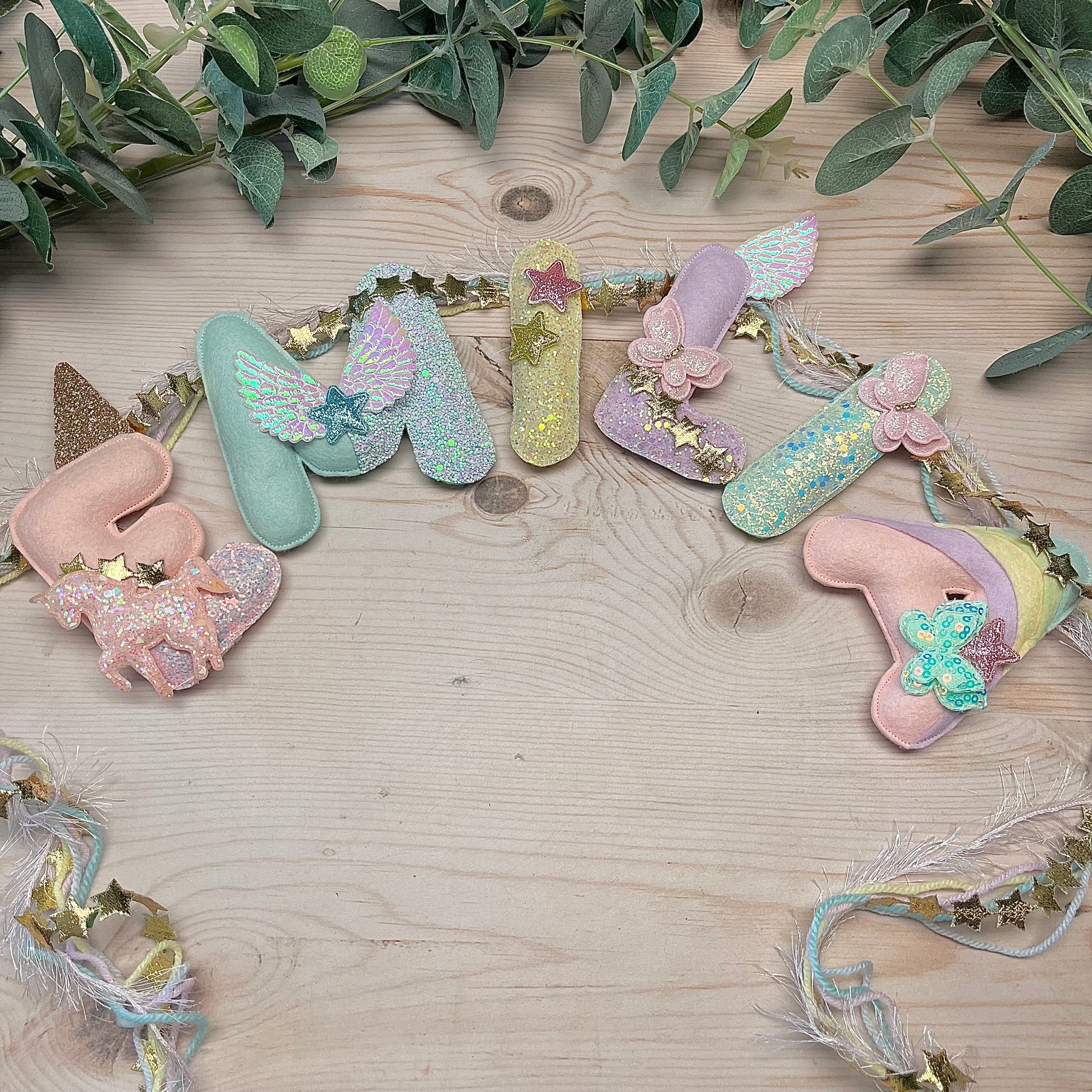 Introducing the enchanting personalised unicorn garland , a mesmerising and one-of-a-kind decorative piece that will add a touch of unicorn magic to any space and the perfect treasured keepsake. Handcrafted with care and attention to detail, this garland is made of felt, glitter fabric, sequins and felt, ensuring a stunning and ethereal finish.