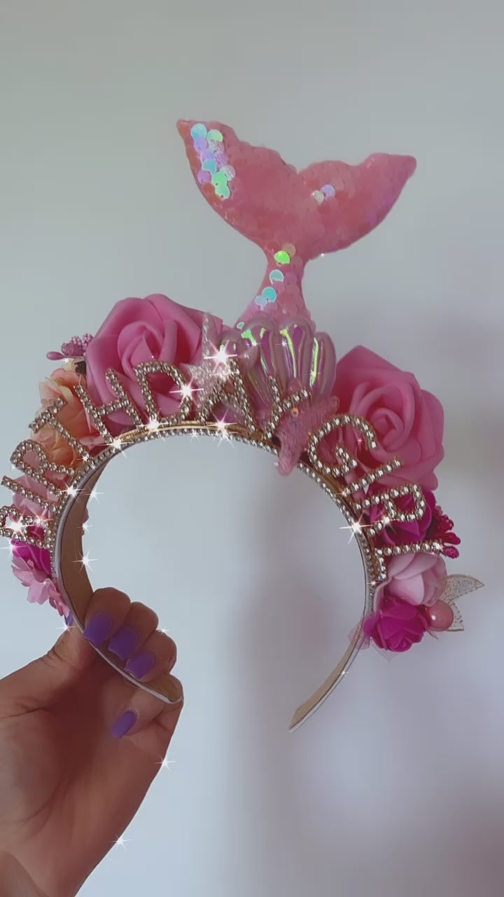 Pink mermaid headband made with a variety of pink flowers finished with shells and mermaid tails.