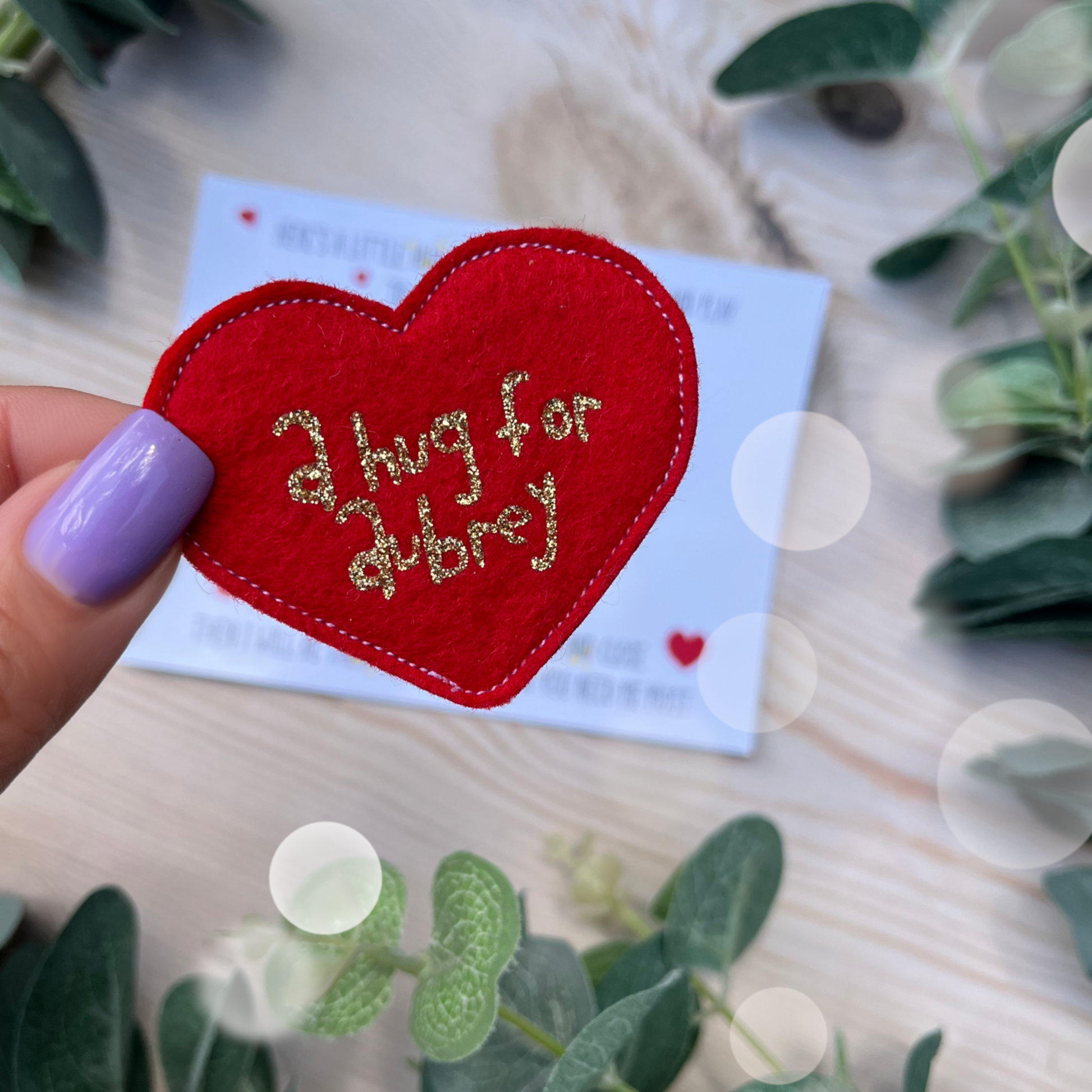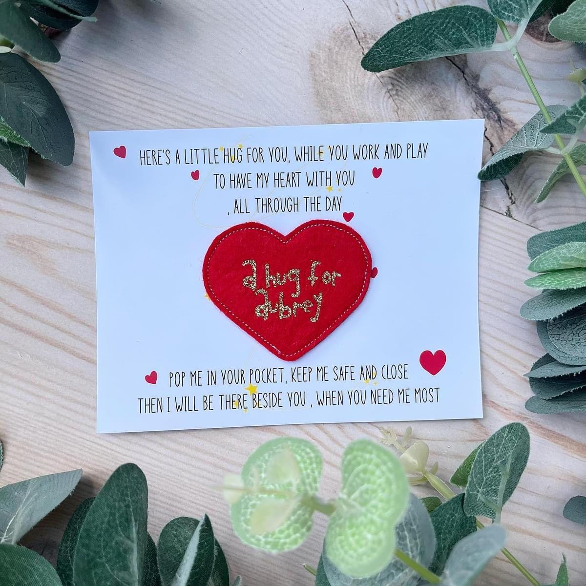 A personalised pocket hug card. Each card comes with a removable heart shaped hug with the recipient’s name.