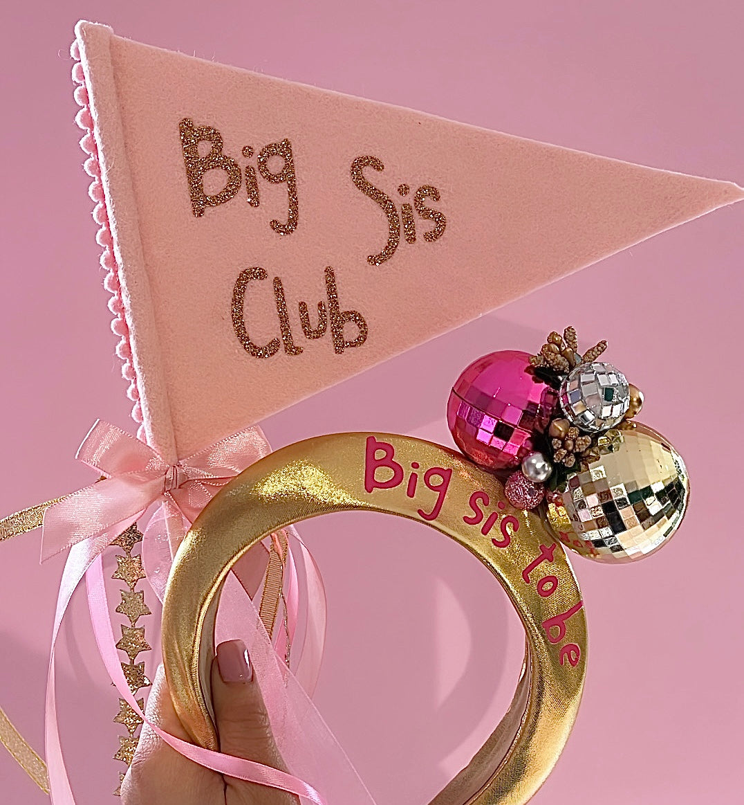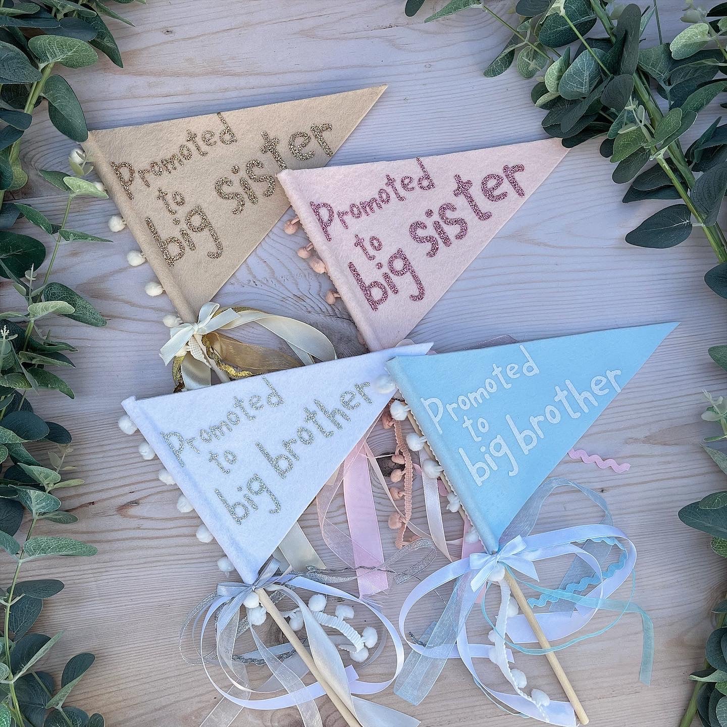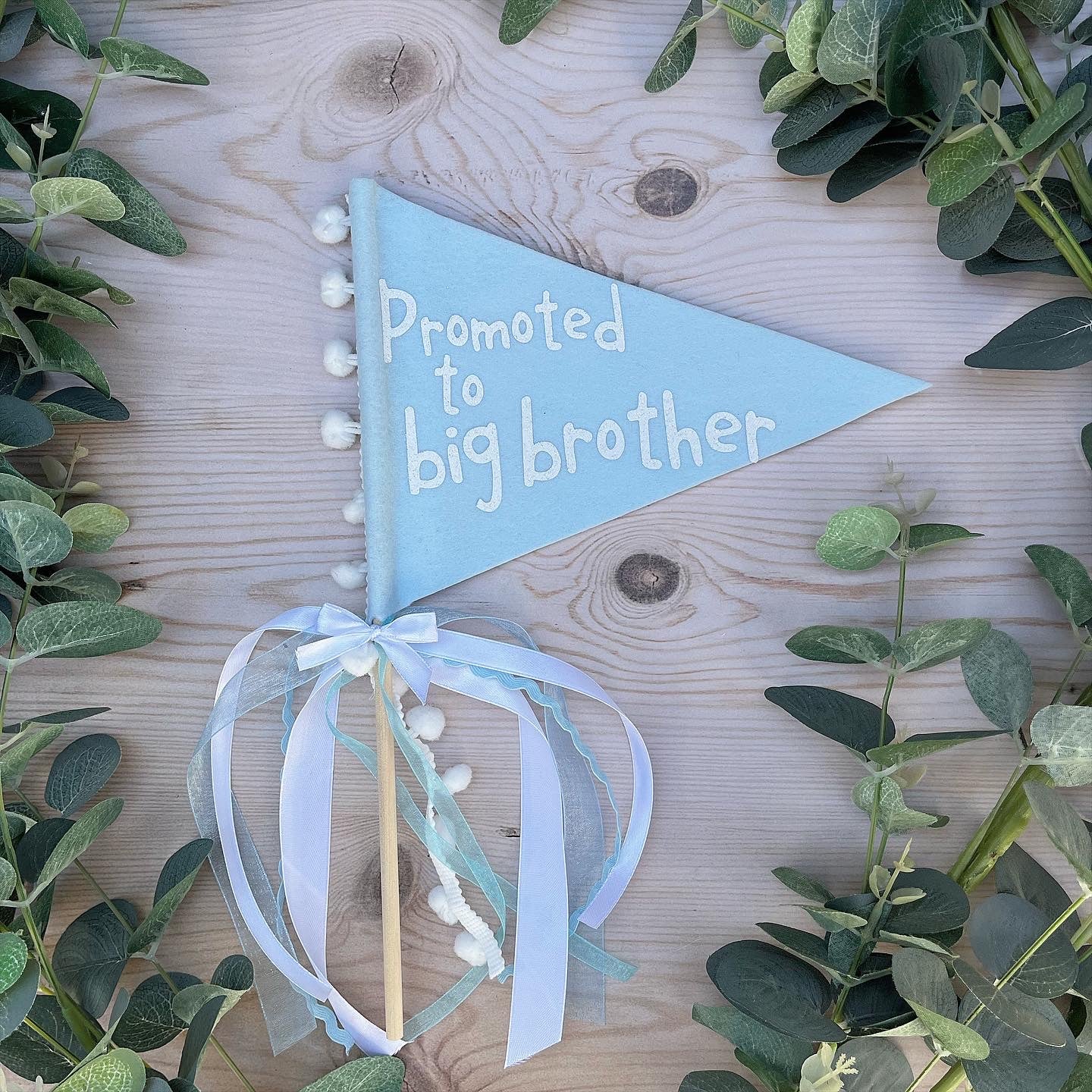 Promoted to big sister or big brother flag with ribbons and pom pom trim in a variety of colours.